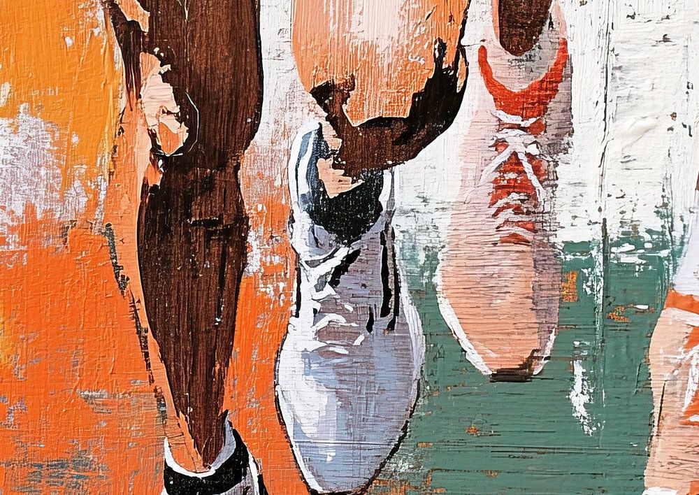 Marathon | Marathon Runners - This sports painting shows the legs of two marathon runners, with colourful running shoes and a dynamic orange background highlighting the speed and energy of the race.