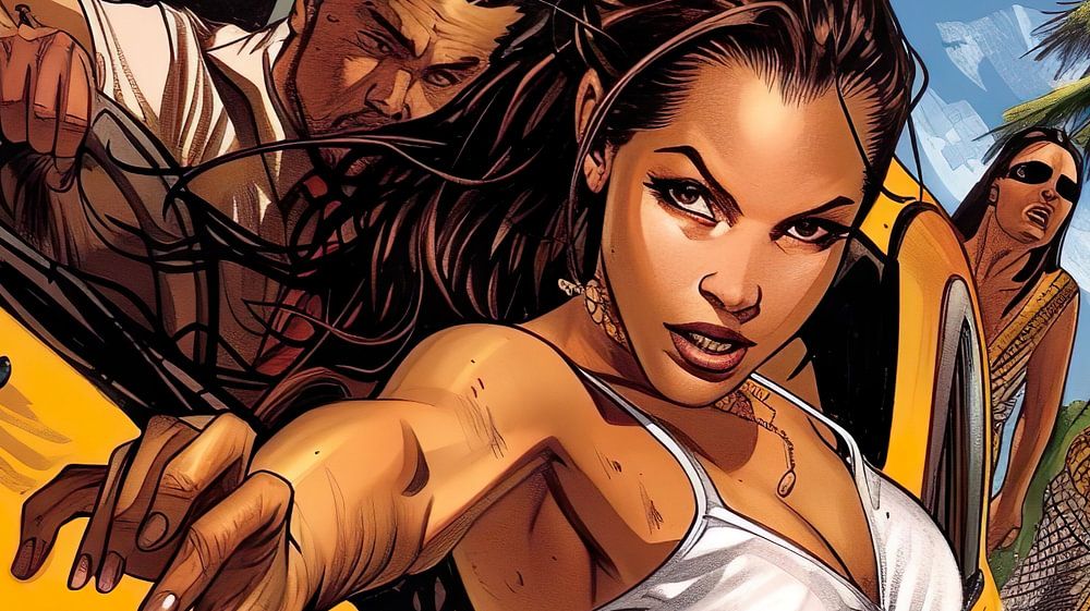 A bride with beautiful brown skin, dark hair and intense eyes escapes in style, directing her breakout in a Citroen Xsara. Surrounded by partying friends, she travels merrily towards the Sarita, with the energy of a Marvel comic book. The scene exudes freedom, joy and a vibrant rebellion against conventions, anchored in cultural splendour and comic book fantasies.