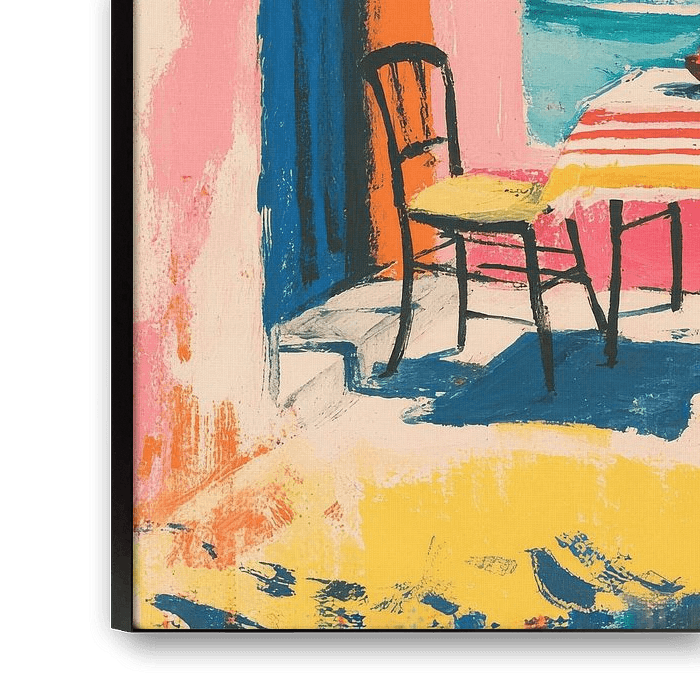 This Matisse-style painting shows a table and chairs on a terrace overlooking the sea. The table is covered with a striped cloth in white, pink, blue and red with fresh oranges lying on it.