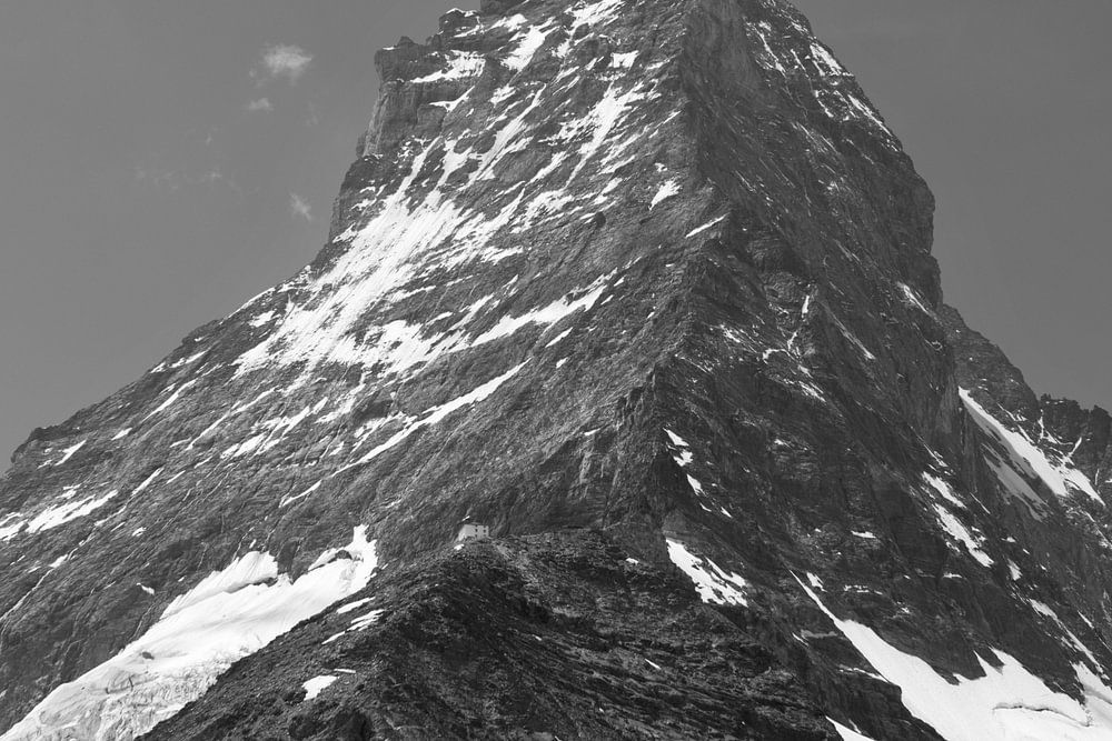 The pointed tip of the Matterhorn seen from the hiking trail to the Hoernlihut at the foot of this famous mountain above Zermatt in the Swiss Alps.
