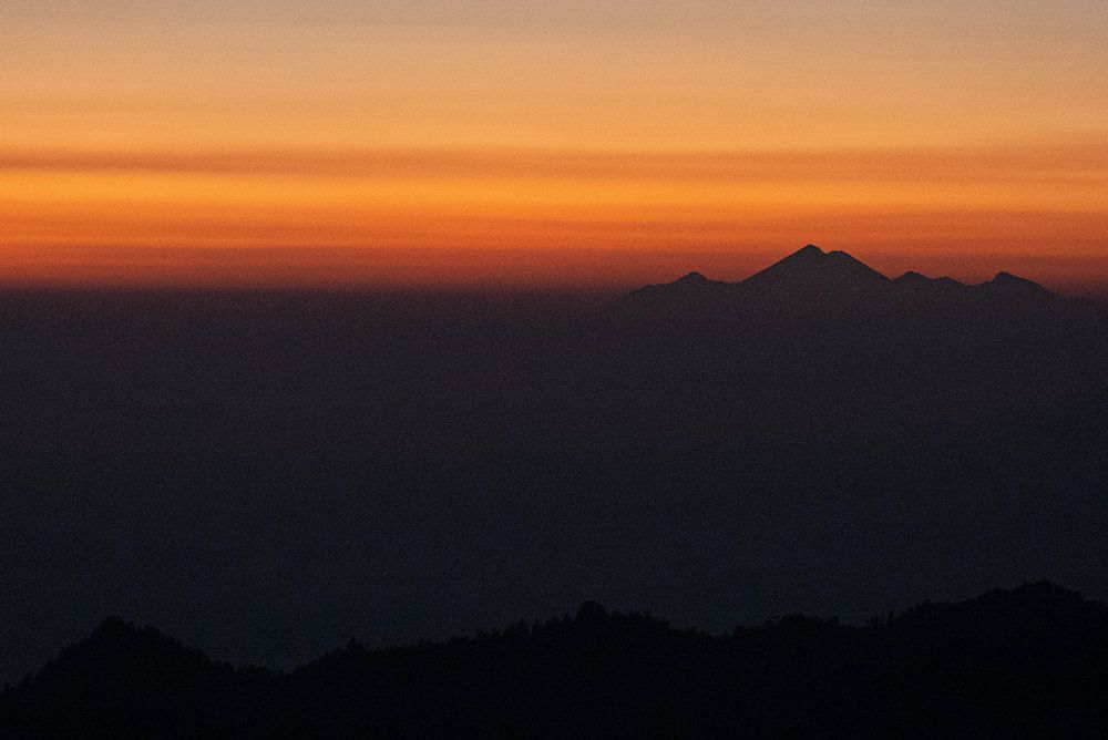 Mount Batur at sunrise. Warm colors of orange and yellow. Mountains still stand out like a silhouette against the colours of the sunrise. Volcanoes island Bali, Indonesia.