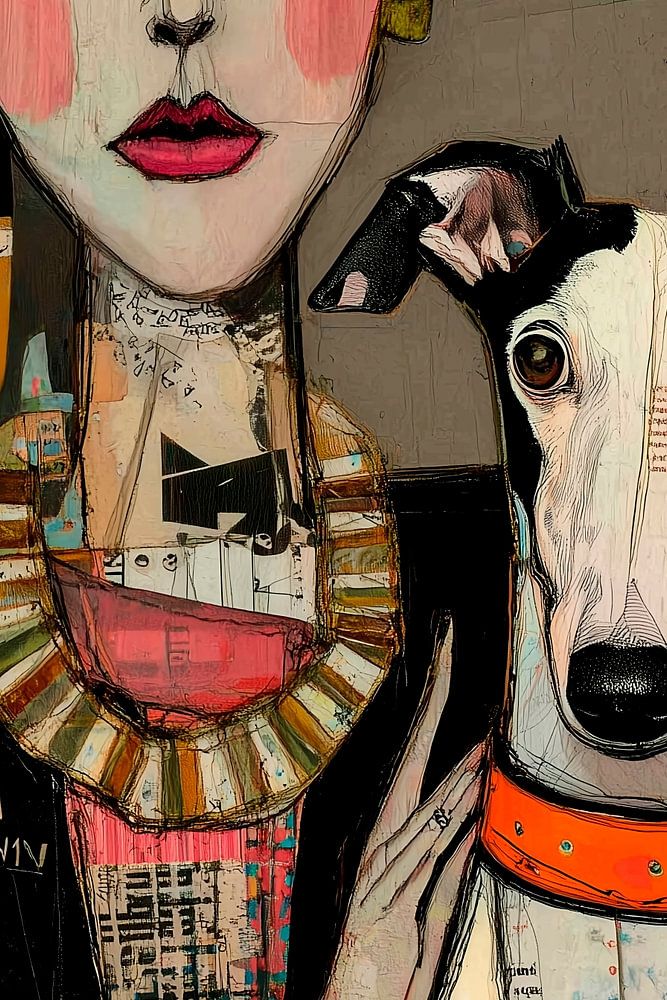 A stylised portrait of a woman and her dog in a contemporary, abstract art style. The woman has striking, large blue eyes and pale skin, accentuated by bold make-up with pink cheeks and dark, tight lips. Beside her a slender graceful dog resembling a greyhound, the background has been an eclectic mix of textures and colours, with layers…