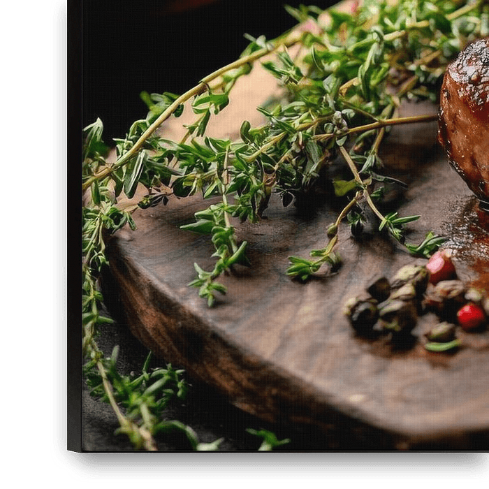 A delicious roast, perfectly grilled and juicy, takes centre stage, surrounded by fresh herbs and colourful vegetables. The deep, warm colours and detailed presentation whet the appetite and invite you to enjoy. This picture is ideal for the kitchen, where it spreads culinary inspiration.