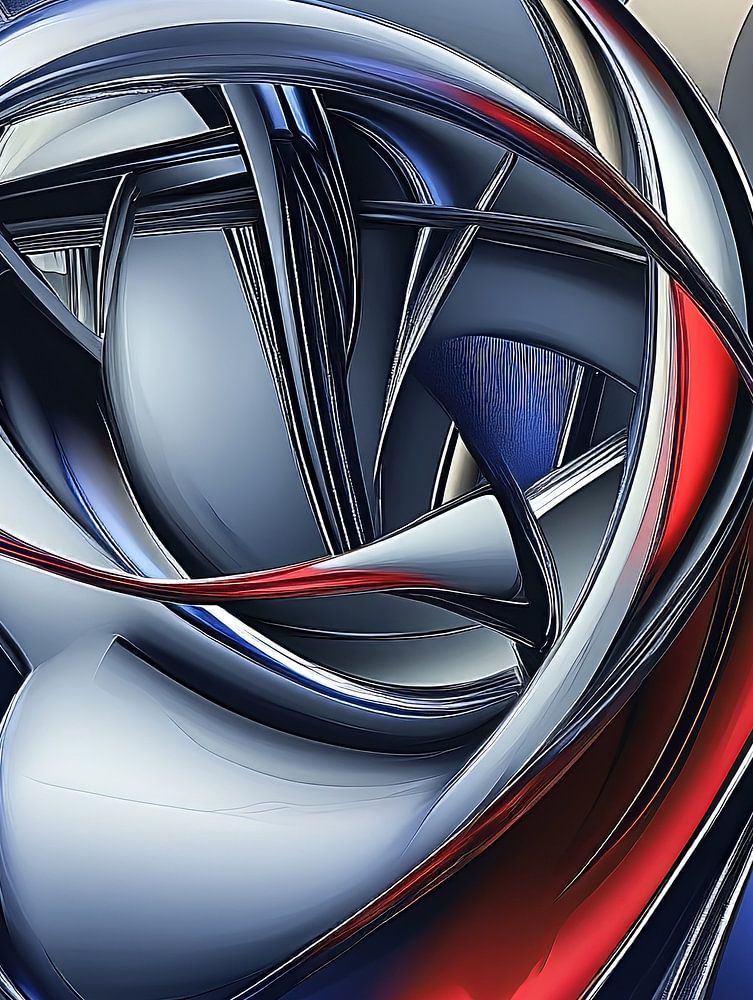 This work captures the essence of futuristic complexity and sleek design. In this work, a steel flower-like structure unfolds, where lines and curves intersect and blend in a harmonious yet powerful composition. The colours red, blue and silver, combined with the polished metal surface, give it a mechanical yet organic look.
