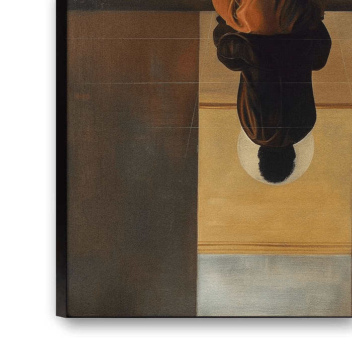 In "Meditation in the Moon Halo", we see a figure in deep contemplation, sitting in front of an ethereal moon. The harmonious earth tones and clean lines create an atmosphere of calm and inner peace. The reflection emphasises the duality of existence and the importance of self-reflection. This work is an oasis of calm in any space, ideal for those seeking a moment of reflection in everyday life. It invites you to pause and reflect, a perfect addition for a study or quiet corner.