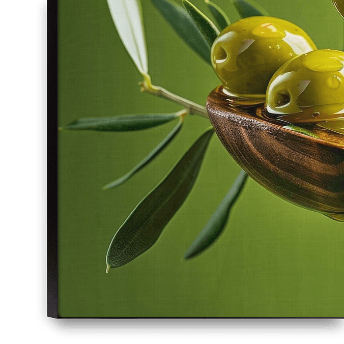 This vibrant image captures the essence of Mediterranean cuisine by showing fresh olives and dripping olive oil in a harmonious composition. The rich green tones of the olive leaves and the golden lustre of the olive oil radiate freshness and naturalness. Ideal for kitchens, restaurants or gourmet corners, this work of art brings the…