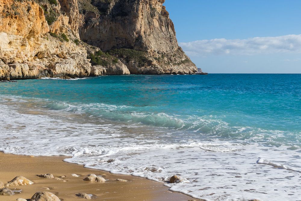 The rocky cove called Cala Moraig enchants with its sandy beach, clear water and vertical cliffs. In the background rises the imposing climbing rock called Morro Falquí. Light limestones meet sand and blue sea water.