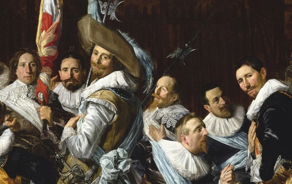 Officers and sergeants of the Calivermen meeting outdoors. The highest in rank are positioned in the foreground: the colonel, captains and lieutenants. The sergeants are allocated a place behind the table; this is the first time that Frans Hals also portrayed non-commissioned officers.