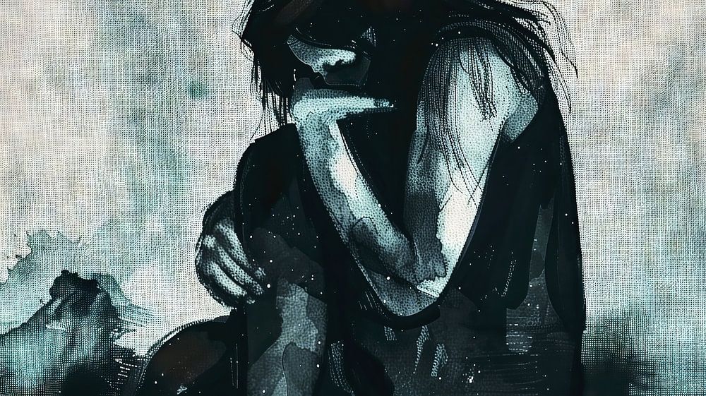 This haunting illustration shows a woman in a moment of deep melancholy, hugging her knees and struggling with her feelings of depression and isolation. She sits curled up, her head slightly tilted, and her arms tightly embrace her legs as if to comfort herself. Her facial expression is characterised by sadness, with closed eyes and a slight, worried frown. The dark, muted colours of the illustration, consisting of various shades of grey, blue and black, reinforce the feeling of loneliness and despair. The background is deliberately kept minimalist in order to focus on the woman's emotional gestures and posture. This portrayal touchingly captures the difficult moments that many people experience in times of emotional pain and inner struggle. It conveys a message of vulnerability and the need for compassion and understanding.
