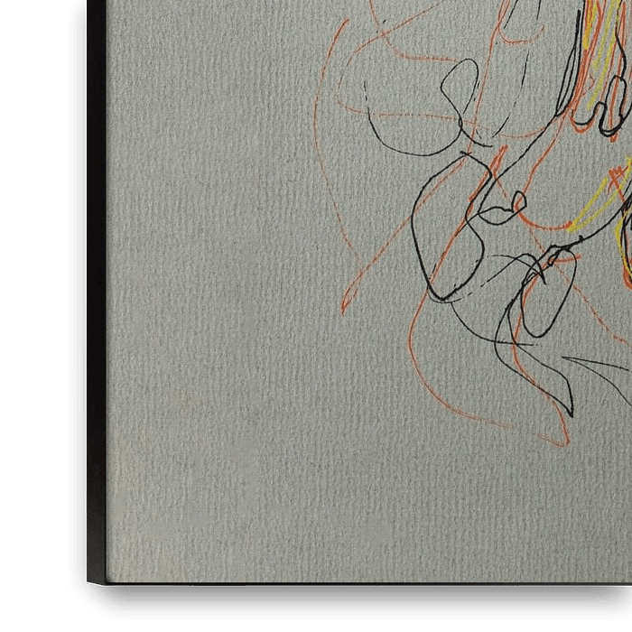 Subtle line portrait. Special technique with organic lines in acrylic paint. Colors: black, orange, yellow and white on grey background.