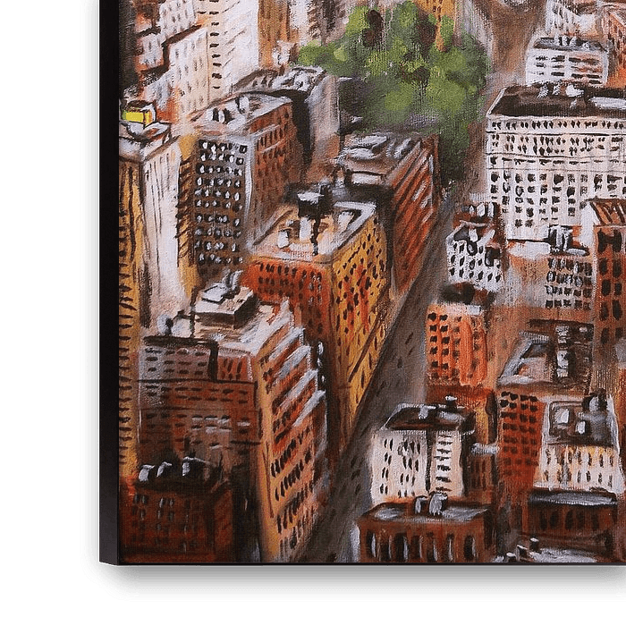 painting with view of Manhattan new york USA / flatiron building / wtc2 and with text "I'm not here" on building