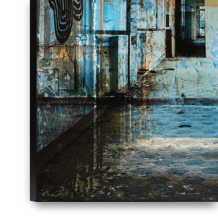 A longing building served as the basis for this multi-layered photographic work. The explosion of colors with blue as overtone symbolizes a multitude of memories.