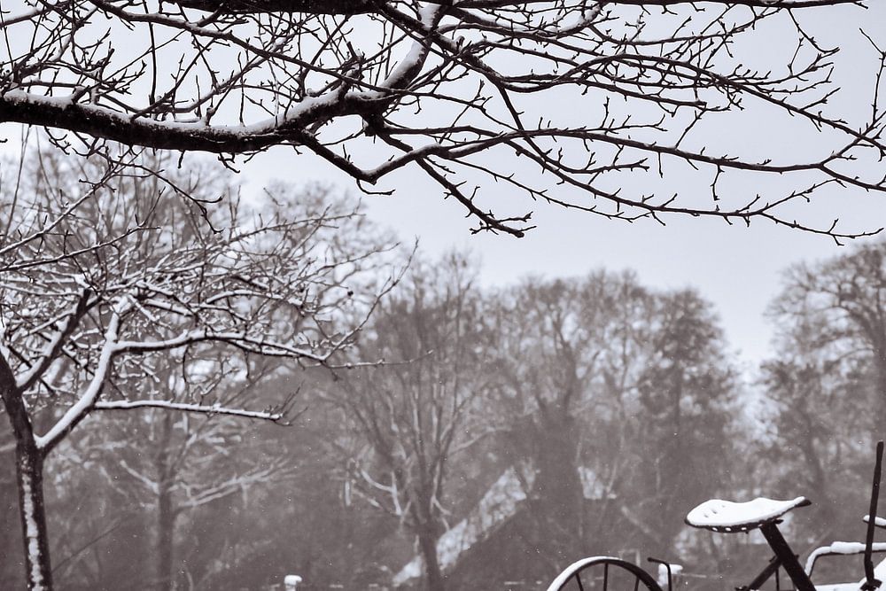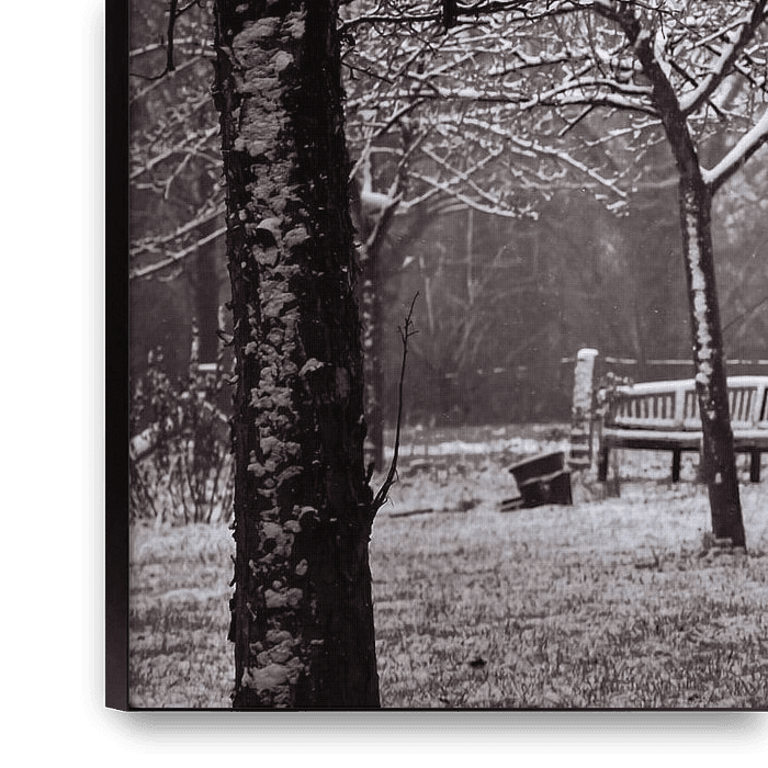 A nostalgic, almost cinematic image of an old agricultural machine covered in fresh snow. The black and white tones enhance the feeling of silence and faded glory. A beautiful decorative piece for a rustic or vintage interior style.