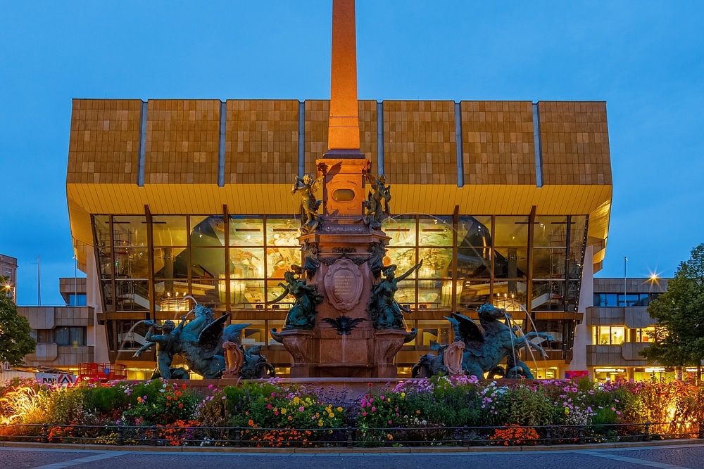 Centre of Leipzig in the blue hour with the Mendebrunnen fountain, located on Augustusplatz in front of the Gewandhaus (Concert Hall). It is the largest fountain in Leipzig and cost 189,000 gold marks to build. It was built by Adolf Gnauth in 1883-1886. Pauline Mende, the widow of a merchant, left her money to Leipzig to build a fountain. In her honour Leipzig gave the fountain its name.