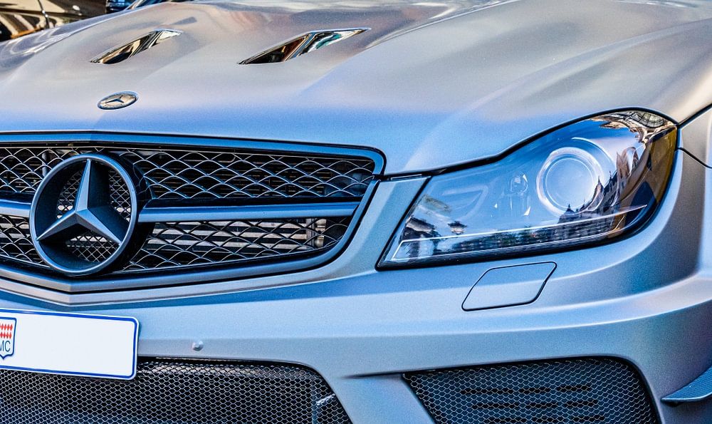 Silver Mercedes-Benz C63 AMG Coupe in front of the Monaco Casino.