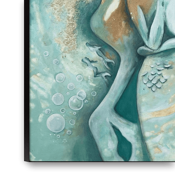 This layered artwork depicts the ethereal world of mermaids, surrounded by waves and subtle bubbles that emphasise their connection to the ocean. Their bodies, partly formed from clay and paint, creates a tactile texture, while golden and turquoise hues evoke a sense of movement and mysticism.