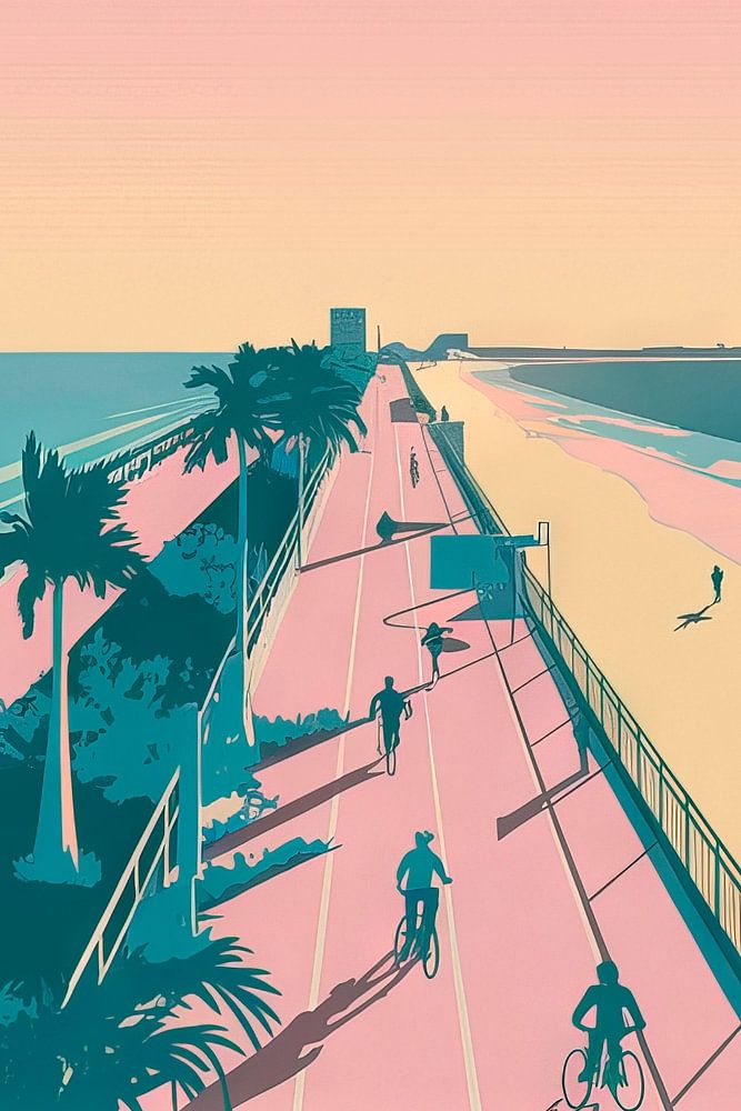 Immersed in soft pastel colours, Miami's beach promenade is lined with palm trees and a picturesque sunset. Cyclists and walkers add vibrant energy to the motif. This artwork perfectly complements a modern living room or creative office, bringing a touch of coastal flair and joie de vivre to any room.