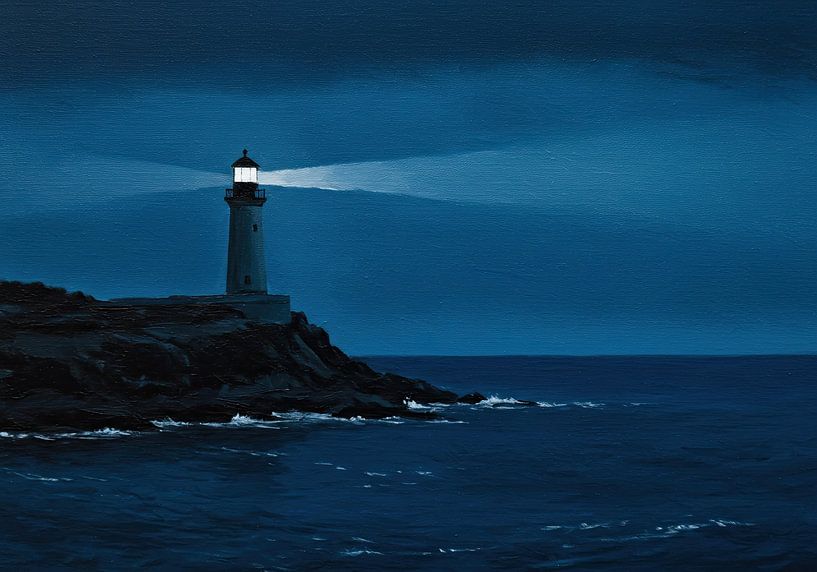 An evocative oil painting of a solitary lighthouse standing on a rocky cliffside under a dark, monochromatic blue night sky. The lighthouse's beam cuts through the gloom, casting a powerful, guiding light over the turbulent, dark blue sea. The mood is one of quiet solitude, strength, and unwavering hope in the face of darkness.