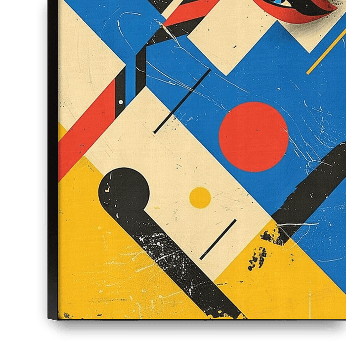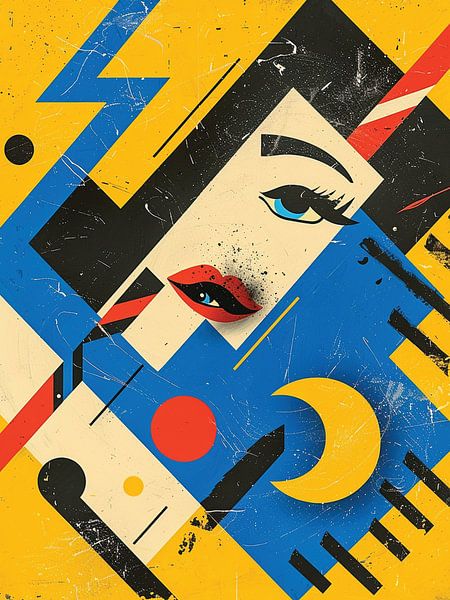 This artwork presents a stylized abstract portrait built from sharp geometric shapes, bold color blocking, and layered graphic elements. A feminine face emerges through intersecting planes of blue, cream, black, yellow, and red, with strong details such as a single expressive eye, vivid red lips, a crescent moon shape, and striped…