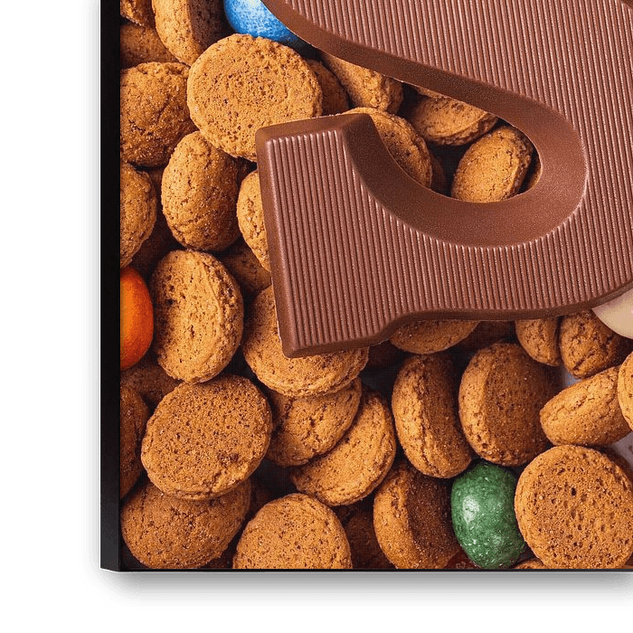 This picture shows a milk chocolate letter "S" surrounded by a variety of candies and spiced nuts. The chocolate letter is brown and has a ribbed texture. Surrounding the letter are a variety of traditional Dutch spiced nuts and pepernoten. The composition of the picture is colourful and festive, reminiscent of the Dutch tradition of Sinterklaas, where chocolate letters and pepernoten are often handed out.
