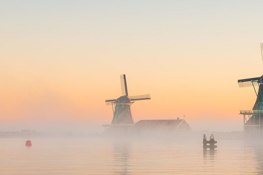 This serene image of Zaanse Schans, captured at sunrise, captures the serenity of a quiet morning in the Netherlands. The windmills rise majestically from a low-hanging mist while the soft, warm light of the rising sun colours the landscape in pastel shades. The reflection on the calm water adds a dreamy atmosphere to the picture, making it seem as if time stands still for a moment. The use of a slow shutter speed creates a soft look that perfectly highlights the stillness and peacefulness of this iconic Dutch landscape.