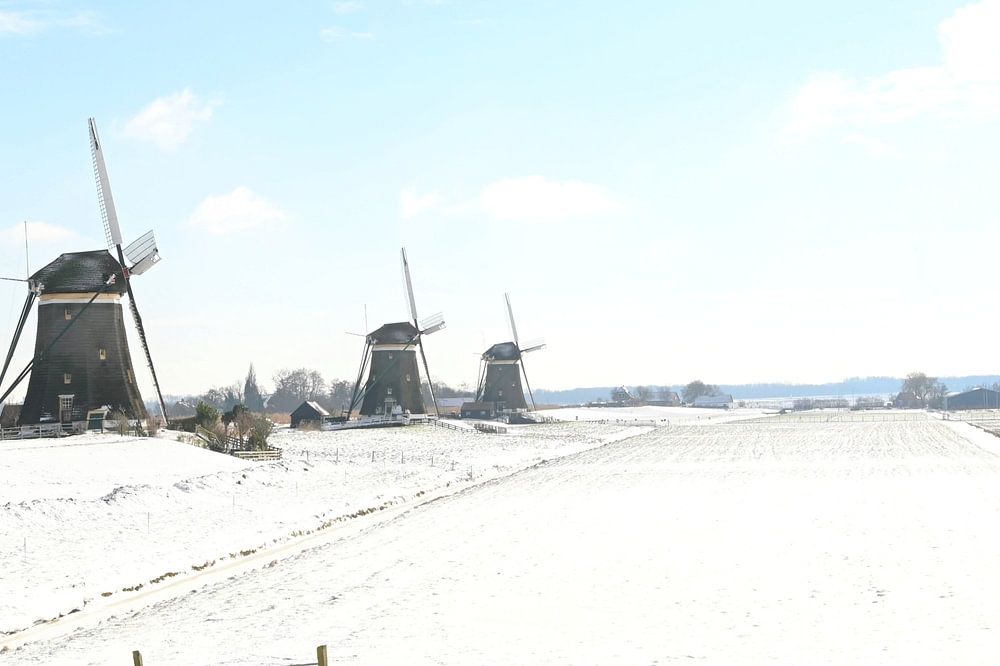 Dutch landscape. 3 mills near Stompwijk in the snow on a beautiful winter day.