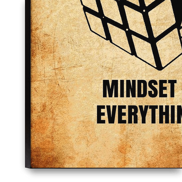 The image features a black and white illustration of a Rubik's Cube against a textured, brown background. The cube is partially solved, with some of its faces showing different colors. The background resembles aged paper with a distressed, vintage look. The text "MINDSET IS EVERYTHING." is written in bold, black letters below the cube,…