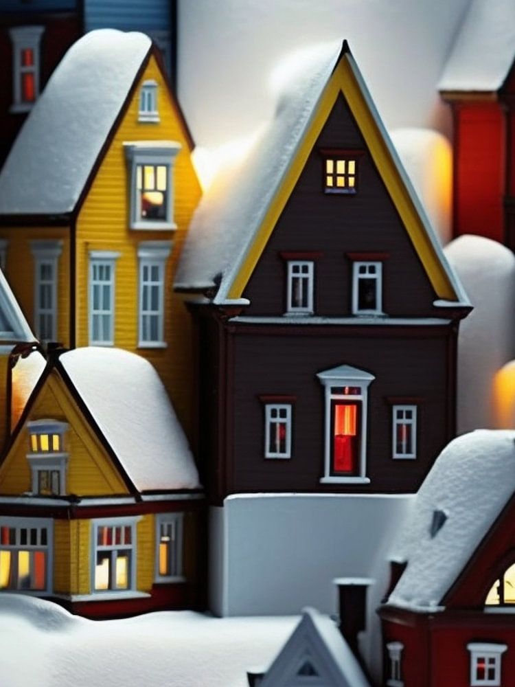The wintry and cosy scene shows a charming collection of colourful, snow-covered houses in a gentle hilly landscape at dusk. The houses glow in yellows, reds, blues and browns, with warm light shining from many windows. Snow covers the roofs and the rolling hills, creating a calm and peaceful atmosphere. Small streetlights illuminate some of the paths. The dark sky hints at a winter's night. The composition is inviting and magical.