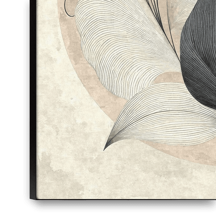 This elegant work of art combines stylised leaves and floral shapes in muted shades of beige, cream and grey. The fine lines and the circular, textured background structure create a sense of balance and calm.