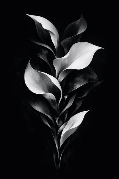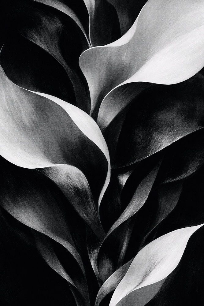 This artwork showcases a minimalist botanical composition rendered in a refined black and white palette. Flowing leaf-like forms rise vertically against a deep black background, creating a sense of balance, rhythm, and quiet sophistication. The smooth transitions between light and shadow emphasize the sculptural quality of each shape,…