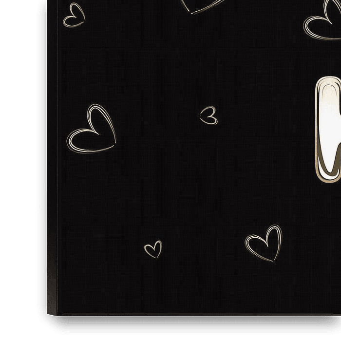 This design exudes simplicity and warmth, with the inviting message Lets stay home depicted centrally. The text is placed in a minimalist style against a black background, with white letters with subtle gold borders emphasising the message. To add some playfulness, a few hearts have been placed around the text, evoking a sense of love…