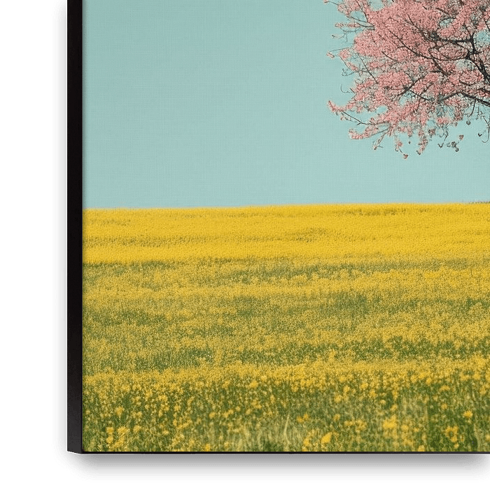 Minimalist image in soft spring colours yellow, blue, white, created with artificial intelligence and photoshop. Contemplative, minimalism, photography, taupe, zen, green, mint, spring, pink tree in landscape, living room