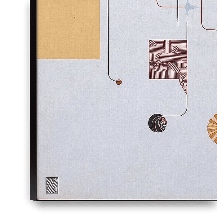 Miró Meets Kandinsky is an ode to these two founding fathers of abstract art. In this series, Miró's playful, organic imagery and symbolic forms fuse with Kandinsky's sense of rhythm, structure and composition to create a contemporary interpretation. This artwork consists of loose, flowing shapes and bright geometric elements moving on…