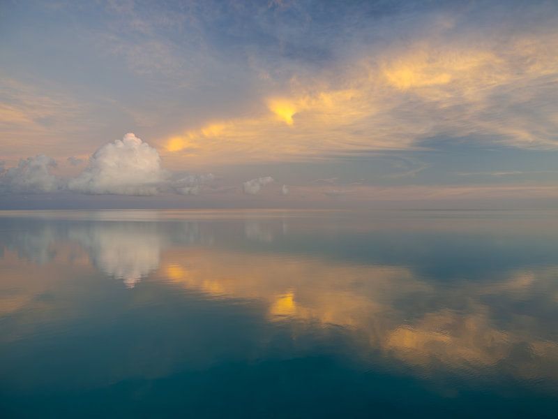 On Makemo, one of the Tuamotus atolls in French Polynesia, the water can be mirror-smooth. While outside the coral reef, the ocean waves pound. The rays of the setting sun reflect through the clouds and through the water to the lens.