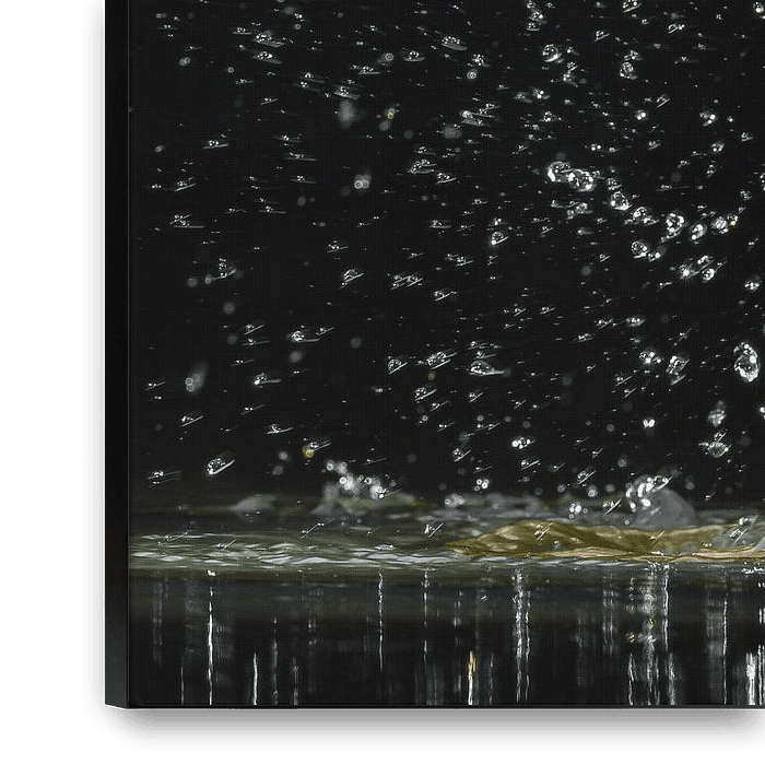 Mission accomplished! A beautiful male kingfisher just left the water with a small fish. The black background and the splashing water droplets really create for a stunning image! This amazing little bird, with a length of approx. 16 cm, has a striking blue colored upper feather deck while the under part is yellow. The difference…