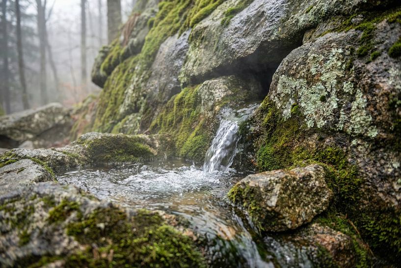 Misty Forest Stream Flowing Over Mossy Rocks