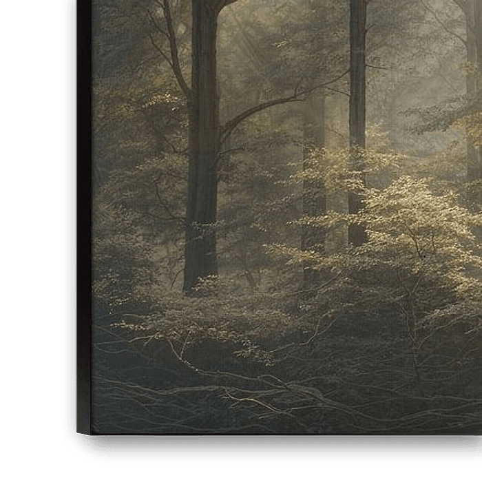 Misty Forest - The painting depicts a serene forest pool in soft morning sunlight, where the rays of light subtly cut through the tall trees and embrace a mystical mist. The colours used are a symphony of warm earth tones, accentuated by the golden glow of filtered sunlight.