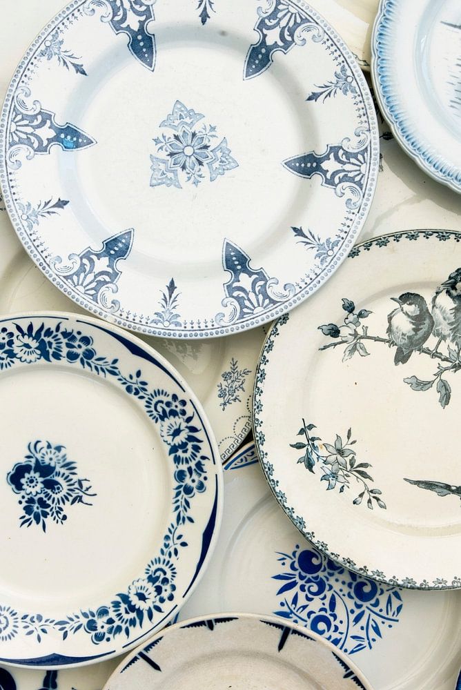 Mix of old blue and white French plates. . Found at all kinds of French markets and brocante shops. Gives the atmosphere of "à la table" in your home. Delft-blue-like colours and beautiful flowers and scenes of, for example, birds on a branch, flowers and a sailing boat.