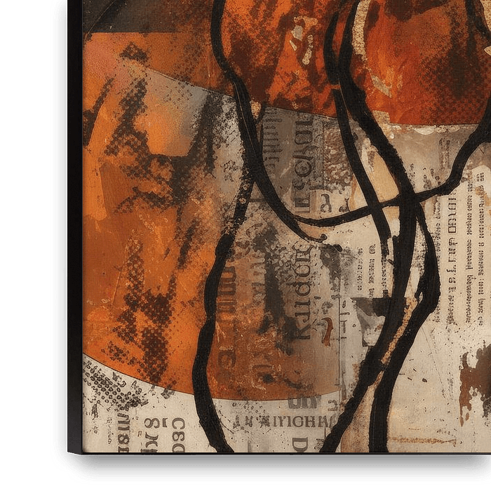 An abstract artwork of a portrait of a woman. In warm colours with rust brown, orange, gold and pink. This work was created using various techniques, starting with a drawing on paper, editing with photoshop and AI edit. The result is a high-resolution artwork with lots of detail and expression.