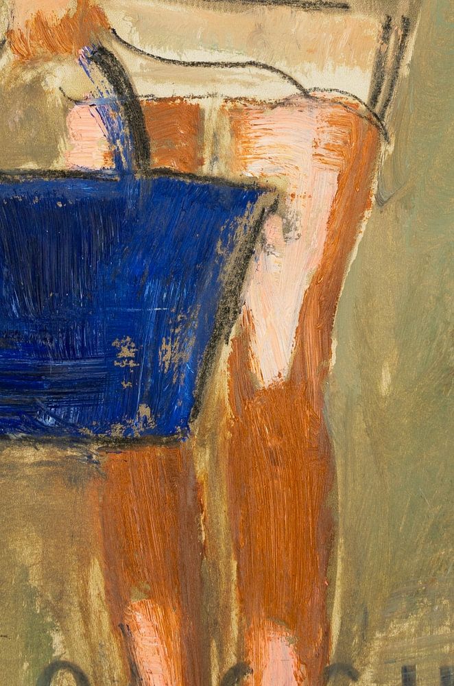 Painting of model, woman with blue bag, ready to go shopping in Paris