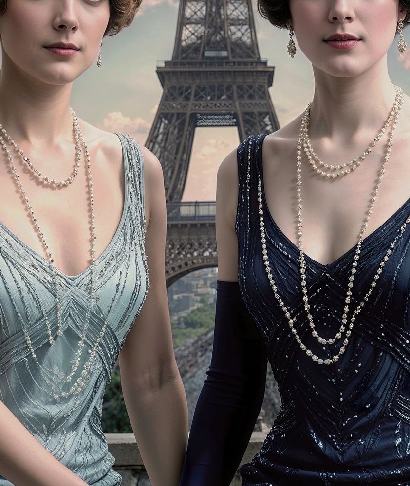 This work captures the essence of timeless elegance and romance, inspired by the glamour of the 1920s in the heart of Paris. Two young women, dressed in sophisticated art deco style, sit in front of the iconic Eiffel Tower, exuding both confidence and nostalgia. Their silk dresses, adorned with delicate beads and embroidery, and their dainty accessories emphasise the grace of the times. The soft, dreamy colours of the sky in the background contrast with the detailed composition of the ladies in the foreground, creating a perfect balance between romance and melancholy.