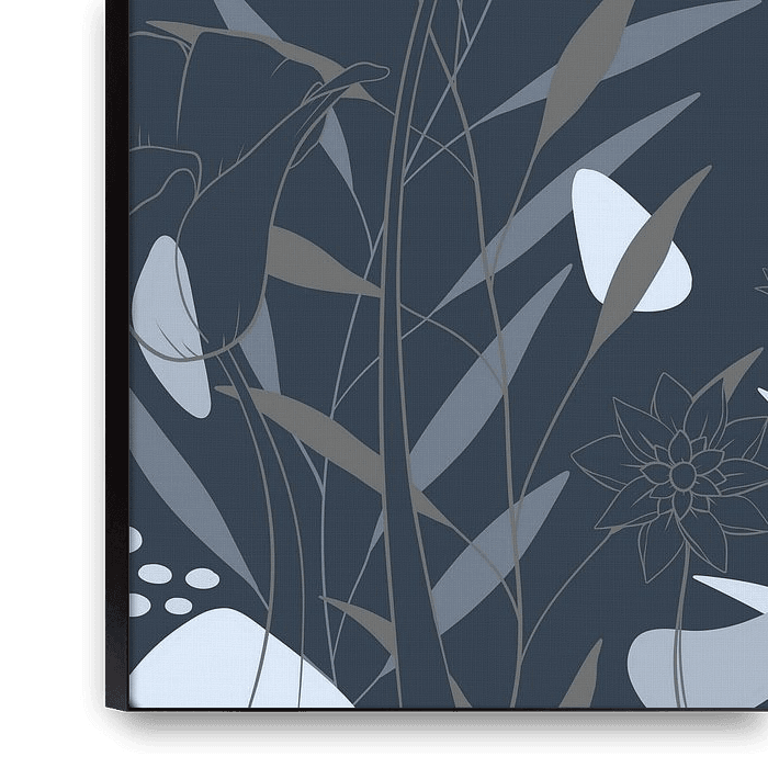 This illustration takes you to a sunny day. The different plants, flowers and leaves alternate in grey and blue. With this dark blue background, this artwork is actually suitable for any space. Whether it's the bedroom, living room, kitchen, study or kids room,