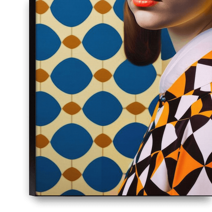 A modern old master girl with a pearl with a nod to today is a work of art where Johannes Vermeer's famous painting has been given a modern twist. The artwork has been digitally edited with geometric shapes and blue and orange hues, giving it a unique and contemporary look. The geometric shapes have been added to give the painting a…