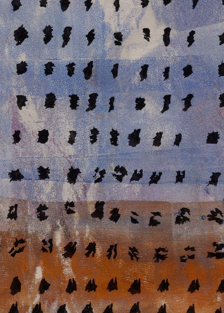 Neutral retro inspired color palette, ink brush strokes and marks, monotype textures.