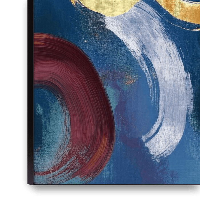 An impressive interplay of vibrant colours and dynamic circles adds an artistic touch to any room. The golden accents sparkle, while deep blues and reds create an atmosphere of elegance and warmth. Ideal for the living room, where it stimulates conversation and acts as an eye-catcher without cluttering the room.