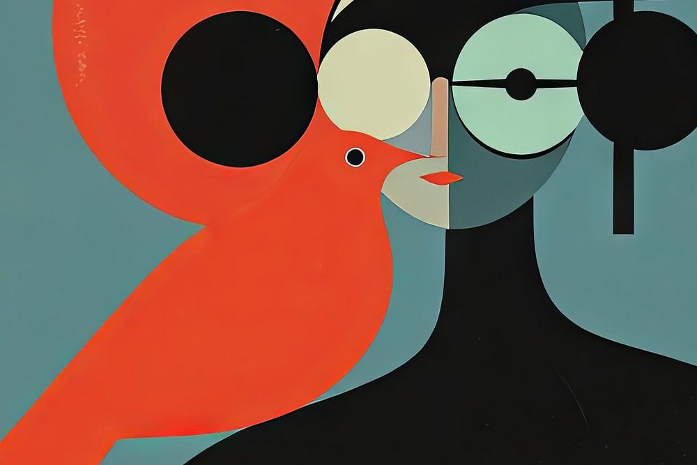 Modern abstract figure , matte teal background, flat black silhouette, circular and rectangular elements forming glasses and head, bold red, vis