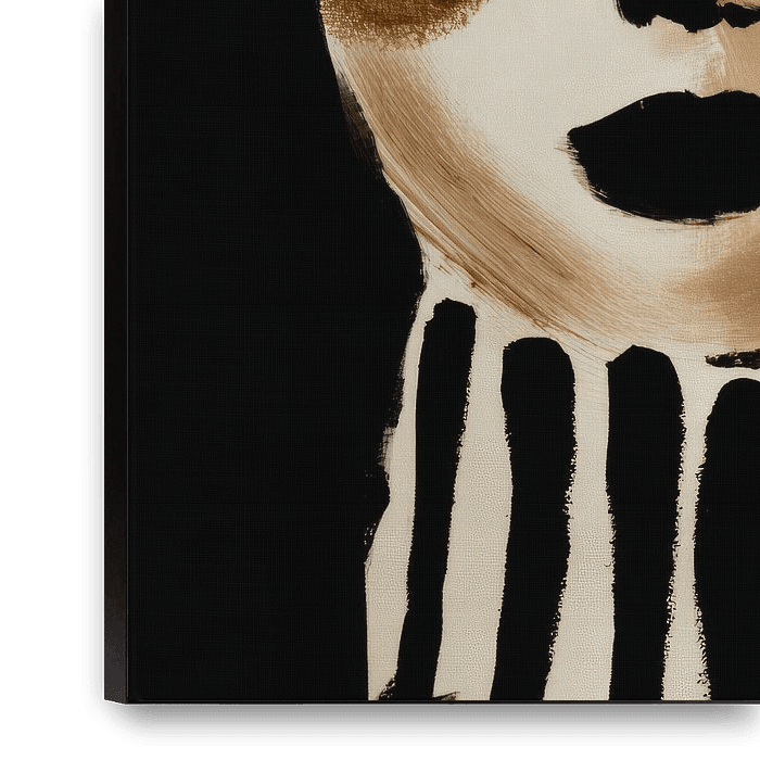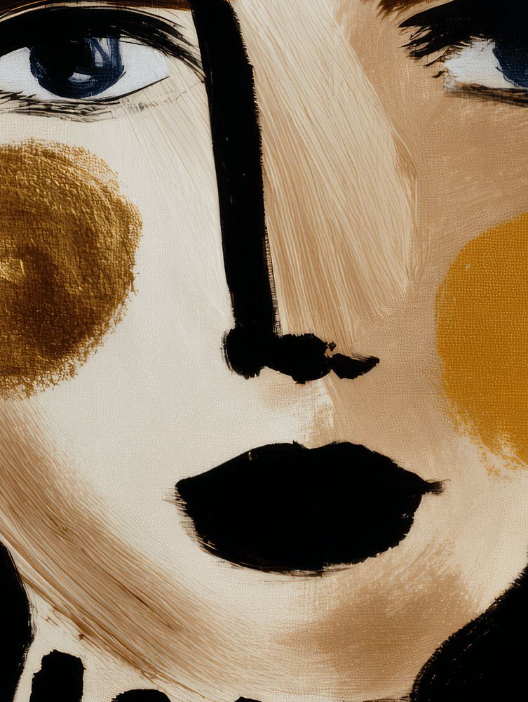 A powerful, modern abstract female portrait with a raw, painterly look. The deep black background almost "lights up" the face out of the image, while the gold and ochre tones provide warmth and luxury. The expressive blue eyes immediately catch your attention and give the work something mysterious and self-assured - as if she is just…