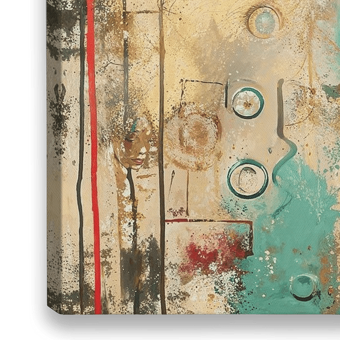 Modern Artwork - In a fusion of urban expression and poetic sophistication, this canvas depicts a female figure bathed in a mosaic of floral motifs against a background of gold and turquoise textures. Fused script symbols and abstract elements whisper stories of past and future, subtly balancing between graffiti and traditional…