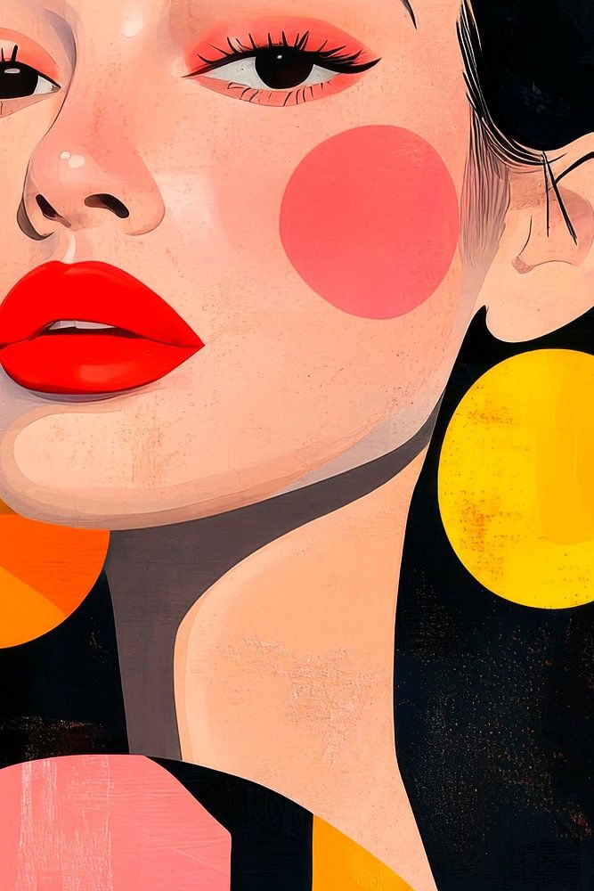 The picture shows a stylised portrait illustration of a woman with bright red lips and eye-catching yellow earrings. Her skin is softly adorned with round, pink-coloured accents, while the background consists of vibrant geometric shapes in blue and orange. The combination of bold colours and shapes gives the artwork a modern, dynamic character.