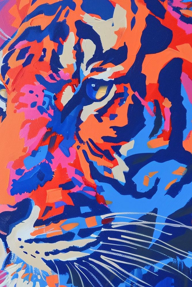 This striking pop art painting of a tiger brings instant energy and colour to any room. The combination of bright hues such as pink, blue, and orange creates a dynamic look that will not go unnoticed. The tiger's powerful silhouette comes to life through the playful and bold colour contrasts. This design is perfect for those looking for a modern and striking addition to the interior, ideal for an office or bedroom where vibrant colours and a touch of artistry are desired. The painting attracts attention and acts as a unique statement piece in any environment. Add this modern artwork to your collection and create a space full of expression and character.